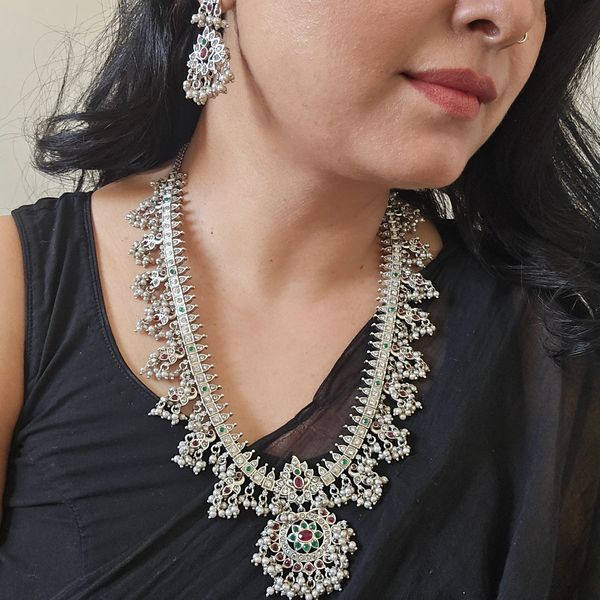 A type of necklace characterized by its fringe-like design with hanging pearls, resembling fish bones. Guttapusulu, also known as Gutta Pusalu, is a traditional form of jewelry originating from the Andhra Pradesh region of India. The name "Guttapusulu" is derived from Telugu, where "Gutta" means "group" and "Pusalu" means "beads." This jewelry style is known for its elaborate and intricate design, featuring numerous small beads, often pearls, arranged in a clustered manner.